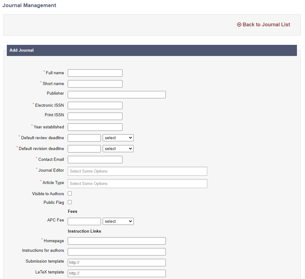 Find the ‘Journals' tab in the 'Super User' Menu. To add a new journal, click on the button ‘Add New Journal’ and fill out the required information.