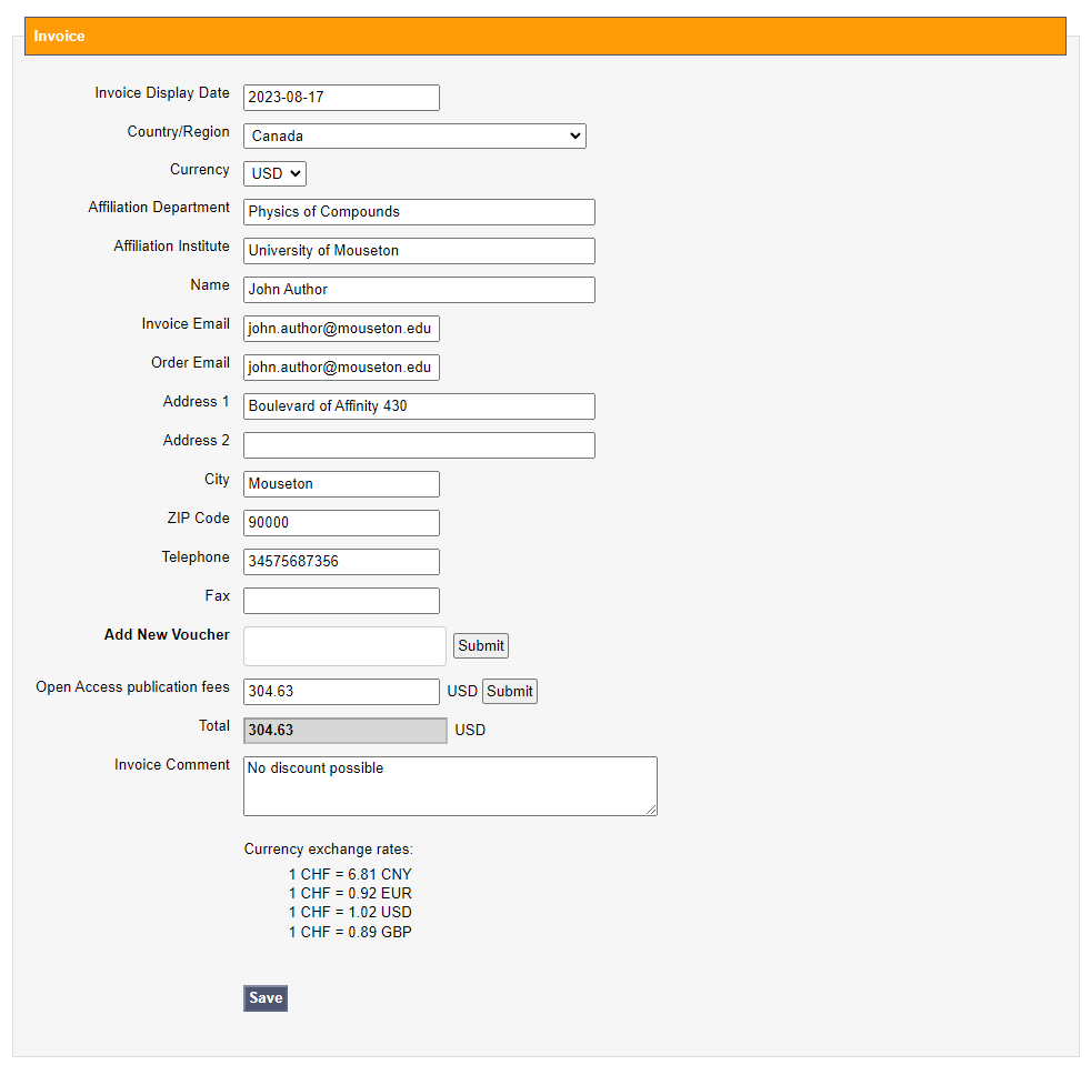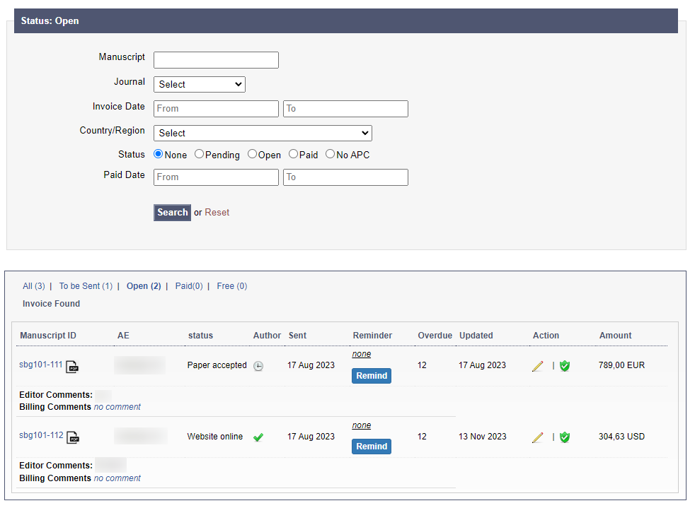 Once the paper is accepted for publication, the system will prompt the handling editor of the manuscript to fill in and save an APC invoice that will be sent out to the billing contact of that manuscript submission (it might be the author or another contact).
