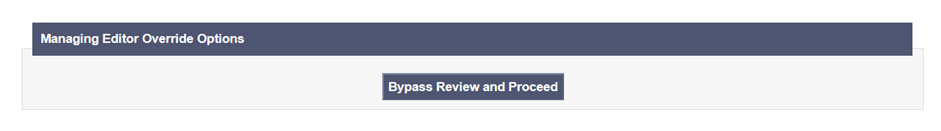 Journal Editors have the option to bypass peer review by scrolling to the bottom of the page and finding the respective button under the “Managing Editor Override Options”. This is useful for editorials, letters, and other submissions that do not require peer review. Other article types must have feedback from at least one Reviewer before proceeding to the editorial decision.