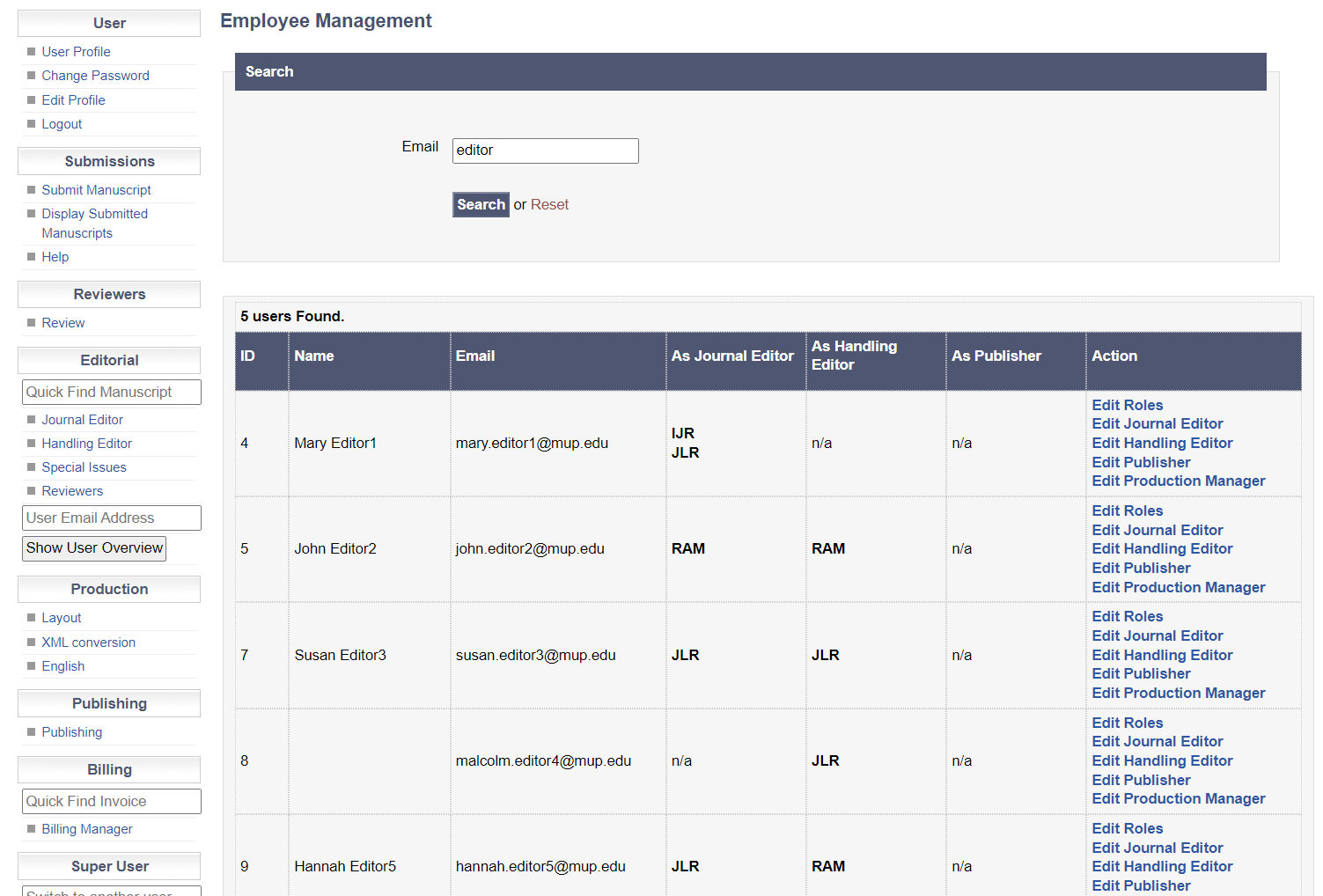 Tenant Administrators, i.e. accounts having the Super User role, are responsible for assigning roles to the team of editors working for the journals. This allows a clear segregation of roles by journal and by responsibility.