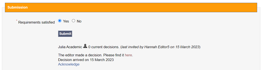 When the technical pre-checl has been completed, the ‘Submission’ step needs to be closed by confirming that the requirements have been satisfied. An email will then be sent to the authors to confirm the receipt of the manuscript.