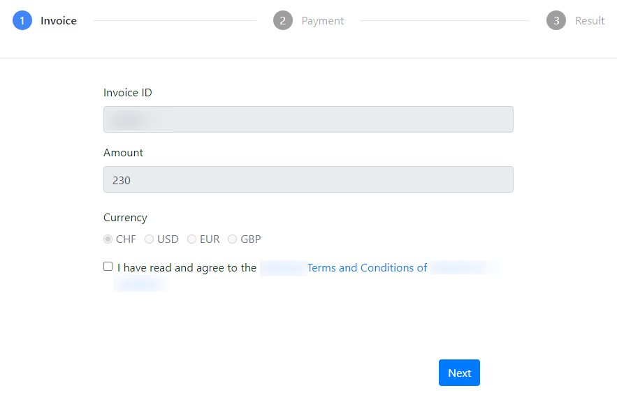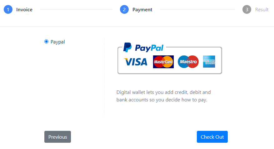 The payment link brings users onto a secure platform where they can double check the invoicing information and proceed with the payment through either their Paypal or Stripe account (which they need to have previously created in order to finalize the payment).