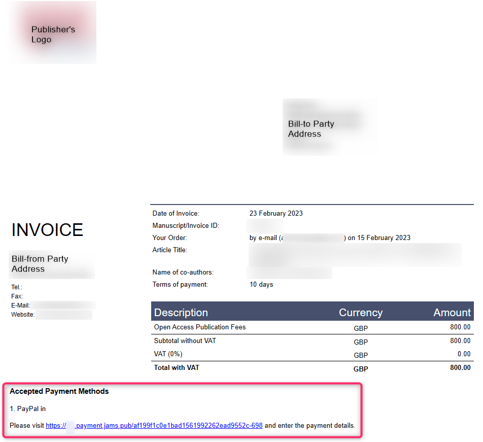 Upon enabling and configuring the Payment Processing application feature, the system generates a payment link for each invoice sent out for billing. Please note that, in order to use payment links, the Billing Module feature must first be enabled to ensure that JAMS creates invoices for the article processing charges.