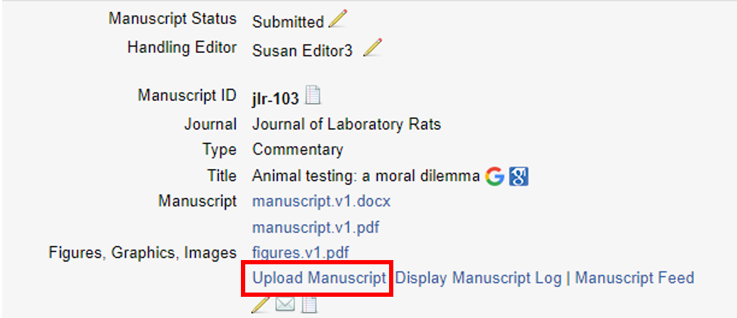 There are two useful links in the header of the manuscript processing page: ‘Upload manuscript’ and ‘Display Manuscript Log’. With the second of these, you can see all previous versions of the manuscript uploaded. By selecting different versions, you can see where specific changes were made and who uploaded which version. The first allows the handling editor to upload a new version of any of the manuscript files at any time.